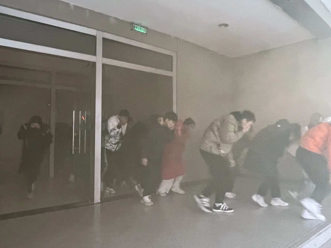 其他小组赶往现场对被困人员进行疏散,组织被困人员手掩口鼻、弯头低腰,井然有序从消防步梯撤离“火灾现场”,并将被困人员疏散至火灾应急场地,配合救援组完成本次抢险任务。
