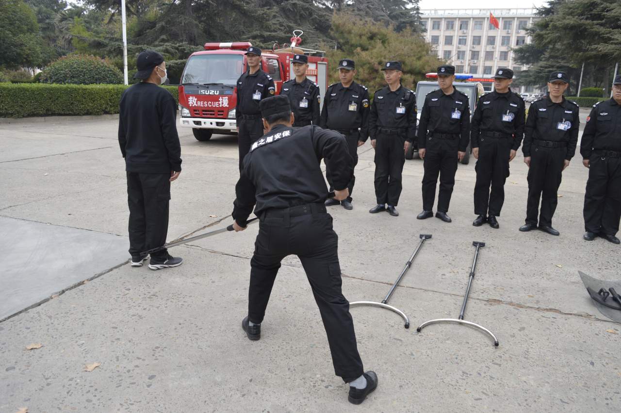 接着,保安队长详细讲解了盾牌、抓捕器、钢叉警棍等防暴工具的原理和使用操作方法。