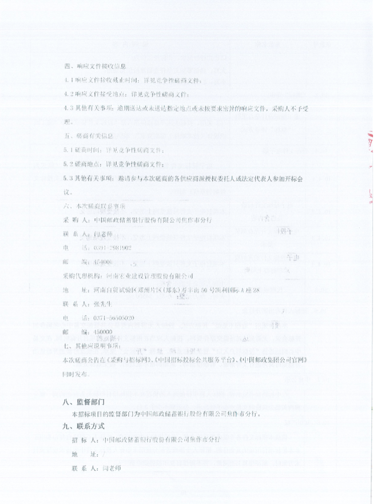 中国邮政储蓄银行股份有限公司焦作市分行保安服务(修武、博爱、孟州、沁阳)采购项目竞争性磋商公告