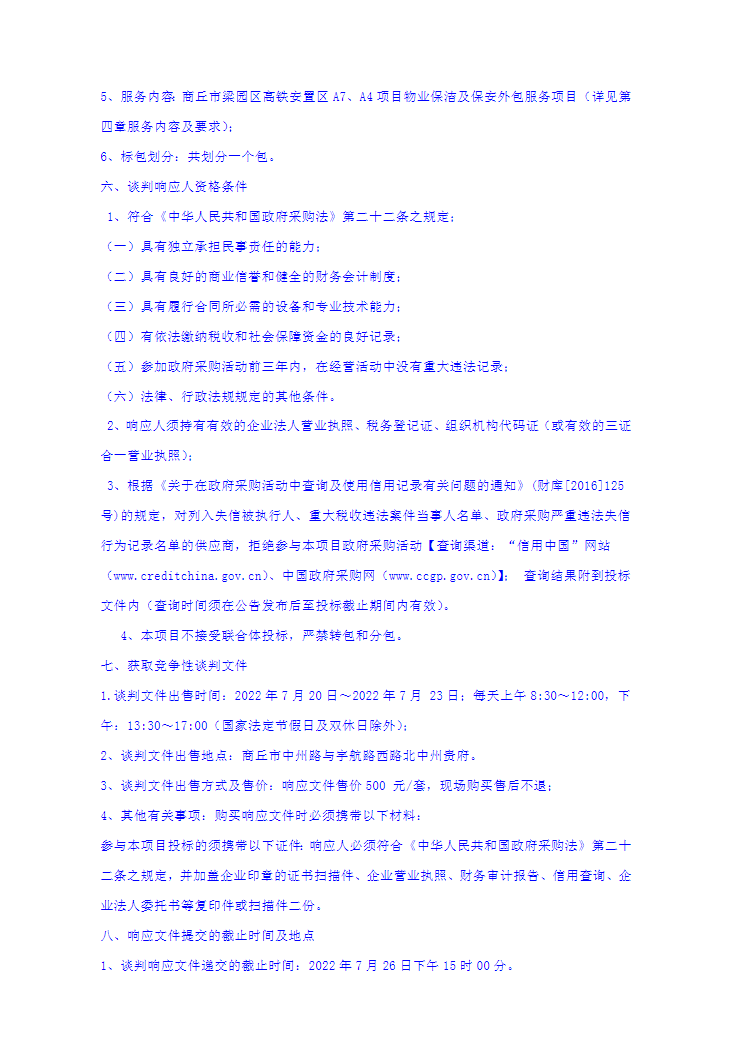 商丘市梁园区高铁安置区A7、A4项目物业保洁及保安外包服务项目竞争性谈判公告