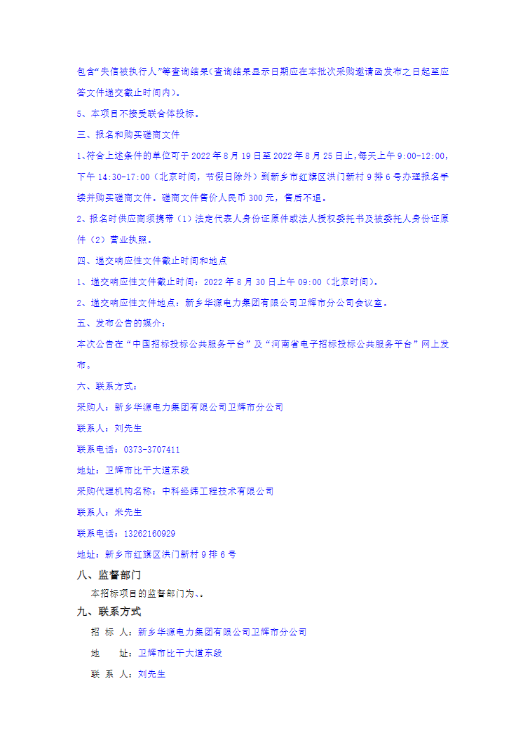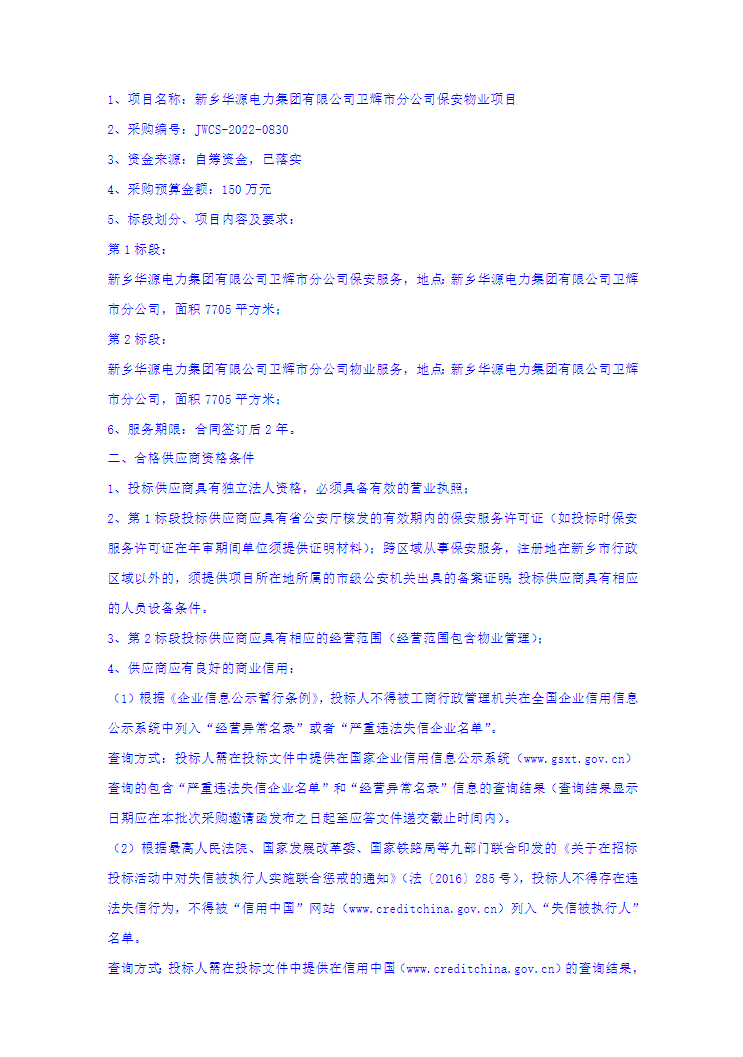 新乡华源电力集团有限公司卫辉市分公司保安物业项目竞争性磋商公告