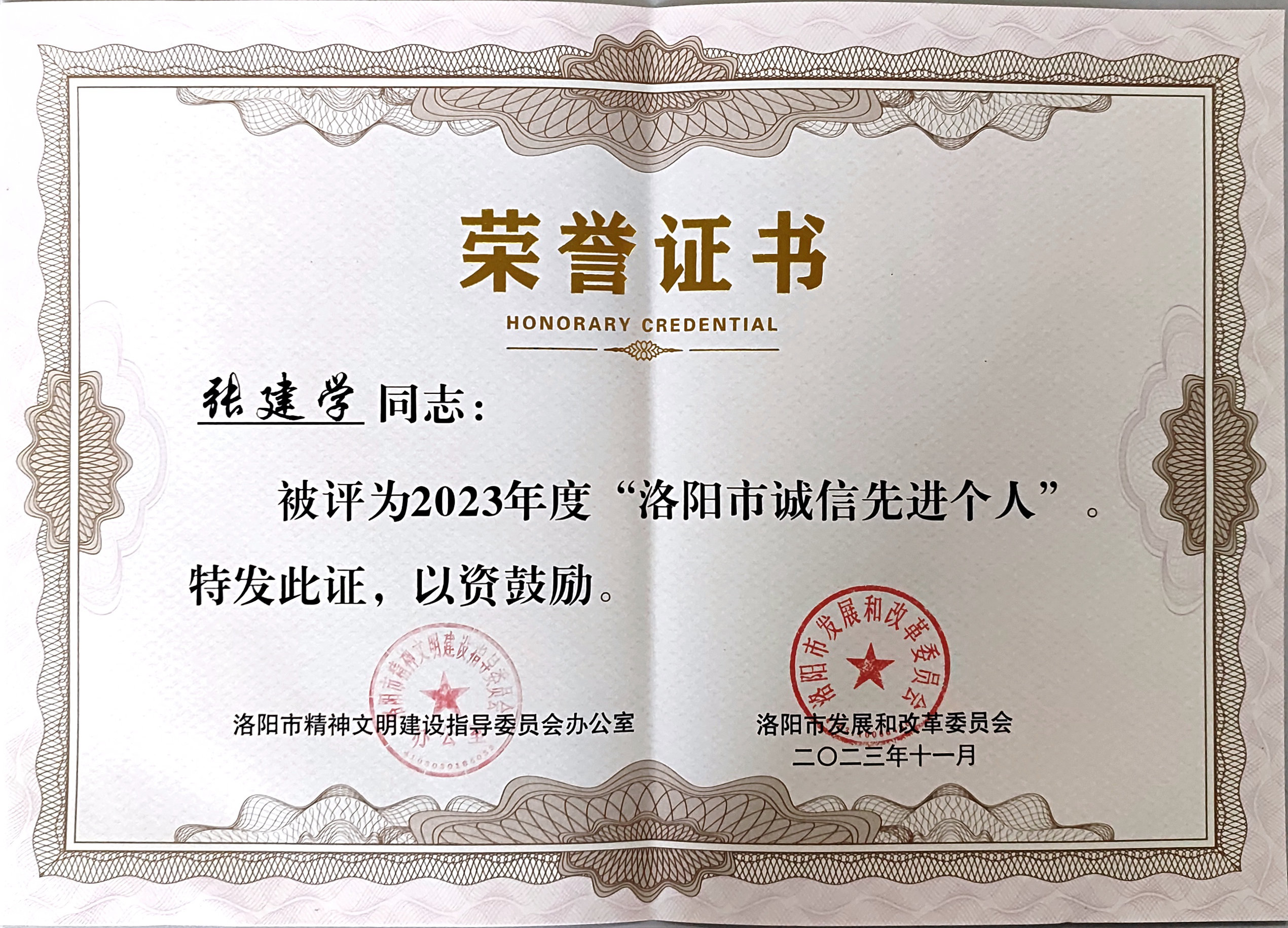 【喜报】公司董事长张建学同志荣获2023年度洛阳市“诚信先进个人”荣誉称号