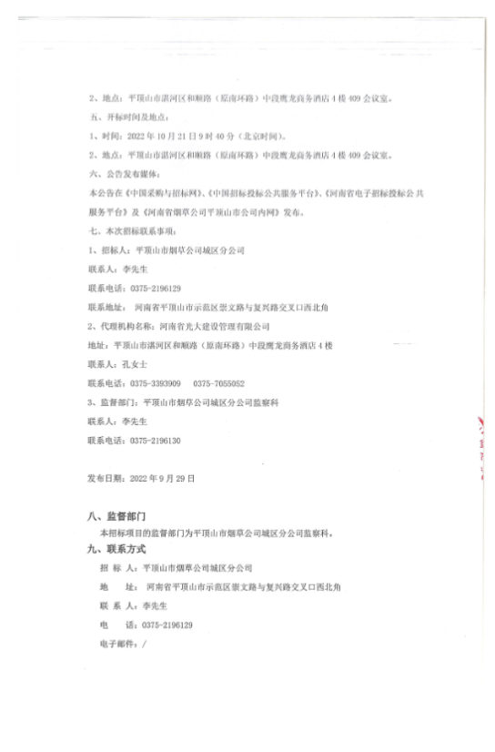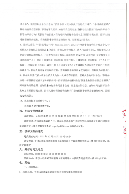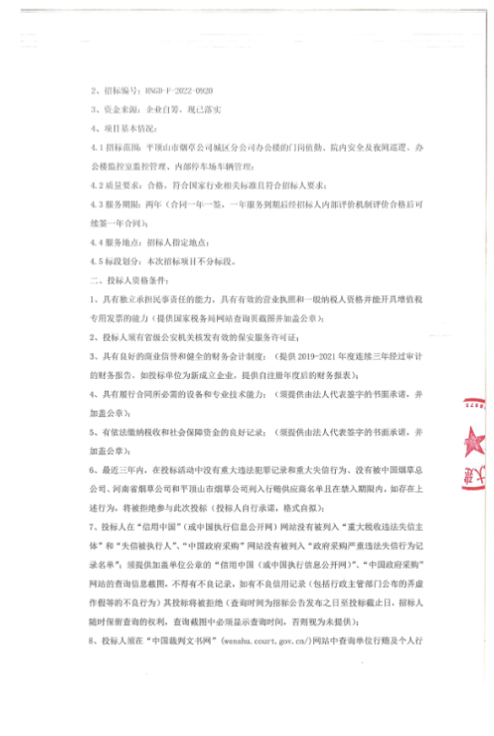 平顶山市烟草公司城区分公司保安服务采购项目公开招标公告