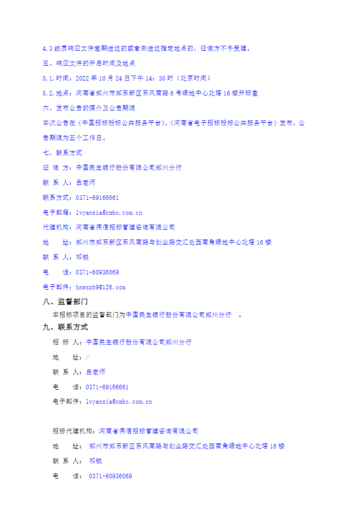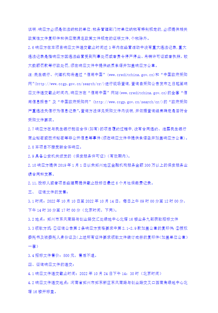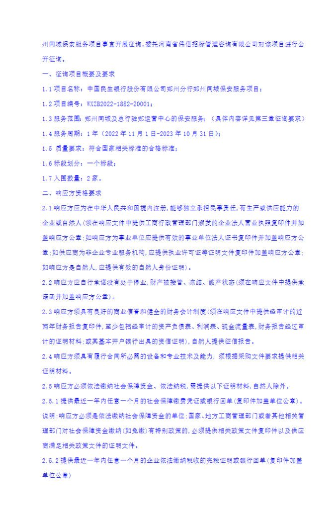 中国民生银行股份有限公司郑州分行郑州同城保安服务项目征询公告