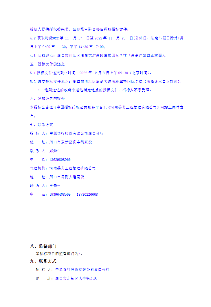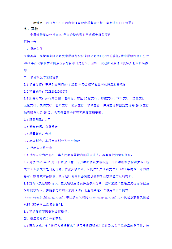 中原银行周口分行2023年办公楼和营业网点保安服务项目招标公告