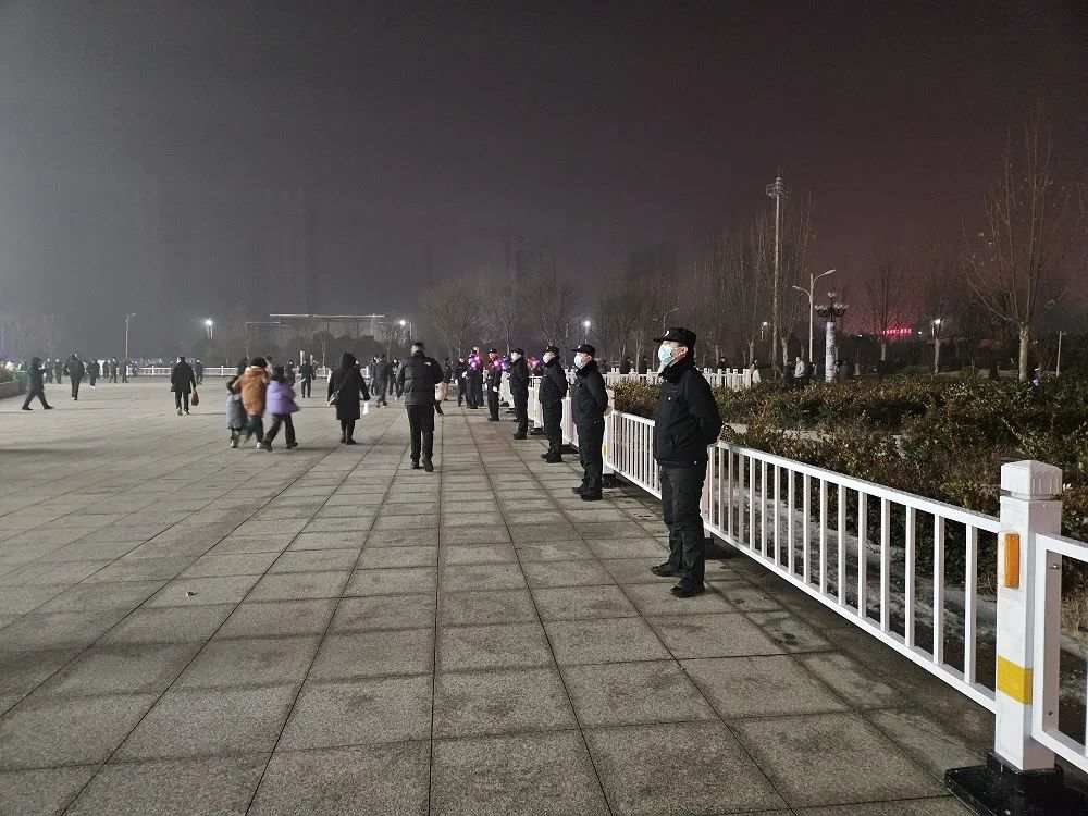活动期间,全体执勤队员不惧严寒,忠诚履职,严格根据安保任务分工及要求,按照“谁主管、谁负责”的工作原则,明确岗位压实责任,坚守在各自岗位上,积极主动,密切配合,逐岗逐点层层落实:在入口通道处有序引导人流、安检、严禁违禁物品进入现场,守好第一道安全防护墙;严格落实各项安保措施,积极开展场内外巡逻防控、人员疏导、处突等各项安保任务;科学设置安全护栏,严禁观众随意攀爬;积极配合公安机关及时调解处理各类纠纷及各类大小安全事故,随时做好应急处置工作,全力确保现场观众的生命财产安全。