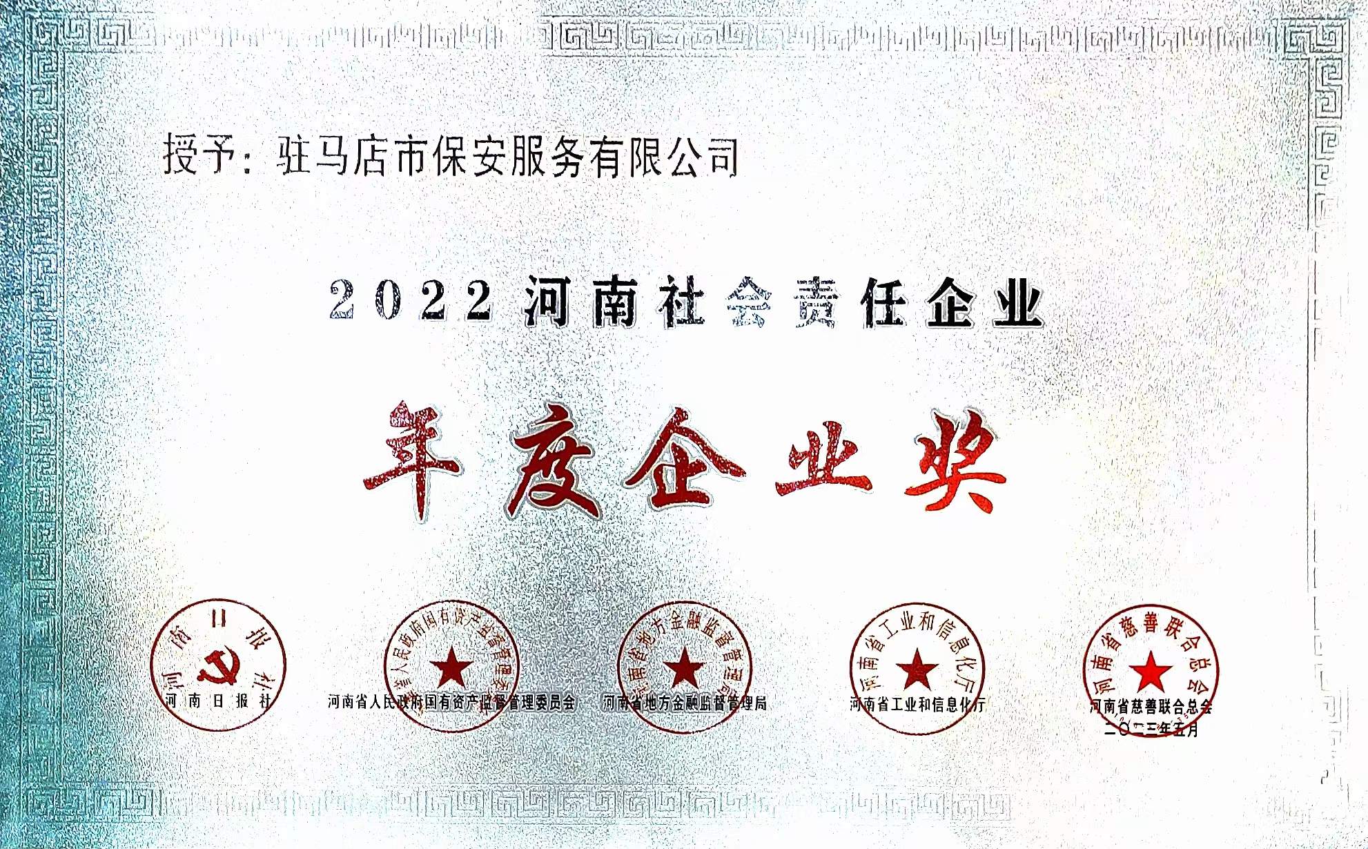 凝聚向心力,画出同心圆。通过广大保安员工的共同辛勤努力,实现了业务发展和安全管理双丰收、经营业绩和经营效益双提升,先后获得上级党委、政府多项荣誉称号:机关党支部被驻马店市直属工作委员会评为“五星级党支部标兵”;4个基层党支部被驻马店市直属工作委员会评为“五星级党支部”;连续3年被河南日报社、河南省人民政府国有资产监督管理委员会、河南省工商业联合会表彰为“河南社会责任企业”;连续3年被驻马店市财政局表彰为“政府采购优秀诚信供应商”;接连获得河南省、驻马店市“双拥共建示范单位”授牌;被驻马店市人力资源和社会保障局评为“诚信服务示范单位”,确定为全市保安和物业服务行业职业技能等级评价龙头企业。