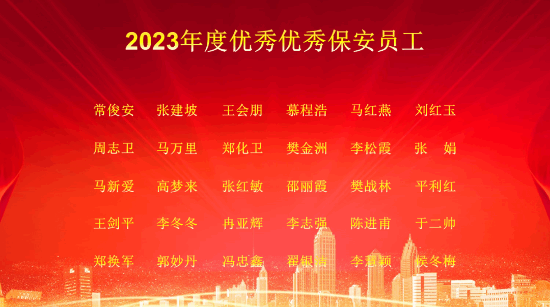 会上共表彰了4名2023年度“优秀中层管理人员”,15名“优秀保安班组长”,30名“优秀保安员”。每一份荣誉的背后,都是忠诚保平安、担当作为、履职尽责、默默坚守岗位的新密保安人不懈奋斗的最好见证。