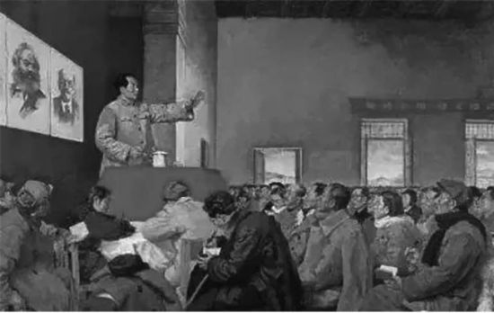 毛泽东作整风报告。(油画) 1942年春,首先在延安开始的整风运动,是在全党范围内开展的一次马克思主义思想教育运动,塑造了中国共产党人独特的人格力量,是加强党的建设的成功实践和伟大创举,对于全党坚持马