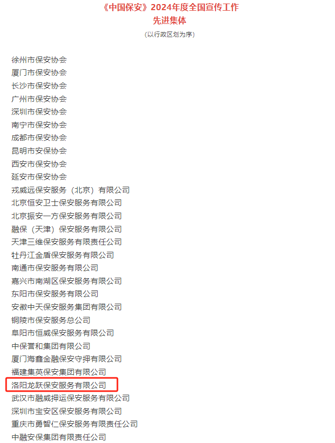 欣闻洛阳龙跃保安服务有限公司及河南威盾保安服务有限公司王旭、南阳市保安服务公司王峰、安阳市洹河保安服务有限责任公司高志娟同志荣膺《中国保安》2024年度全国宣传工作“先进集体”与“先进个人”荣誉称号,