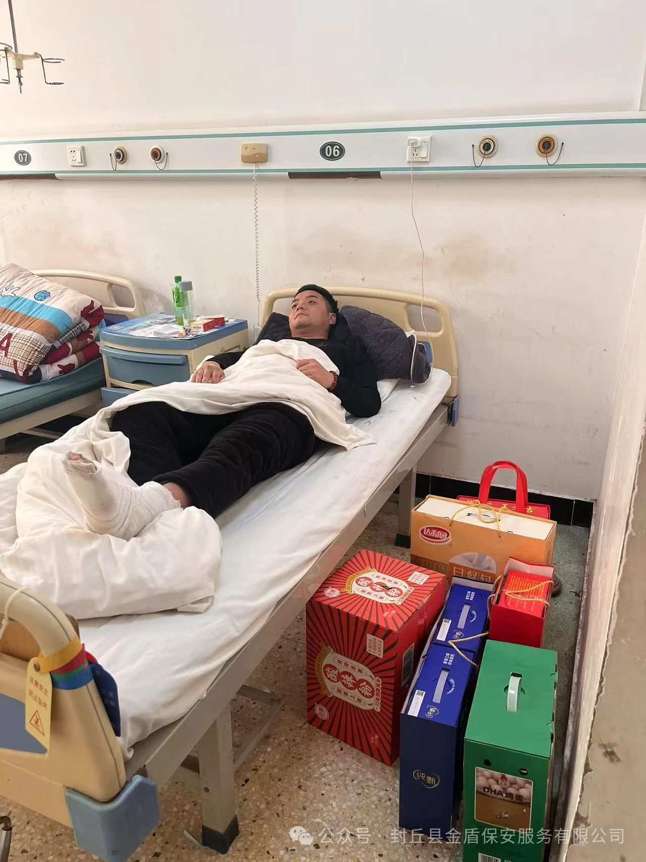 2025年1月7日上午,公司总经理张付顺和工会主席兼人防经理张建军、押运经理袁政军、押运大队长李振鹏一行四人,前往封丘县中医院去看望慰问因公受伤的车长贾国鹏。 贾国鹏对公司领导的到来发自内心的表示感谢