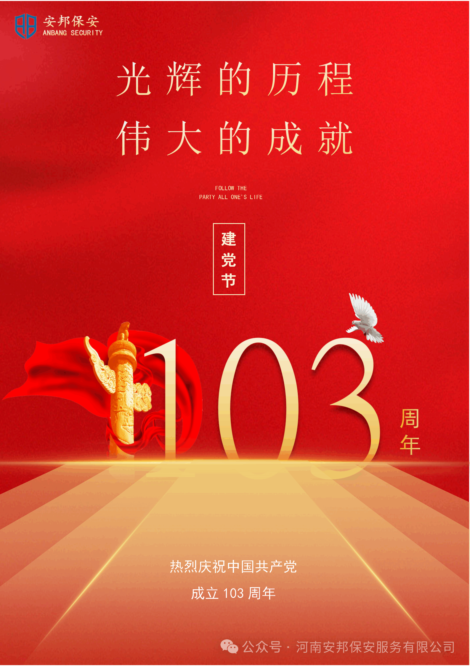 在这个金色的七月,我们迎来了中国共产党建党103周年的伟大时刻。103年,对于一个人来说,可能是漫长的一生;但对于一个政党来说,这却是一部波澜壮阔、激荡人心的奋斗史。 河南安邦保安服务有限公司始终坚持