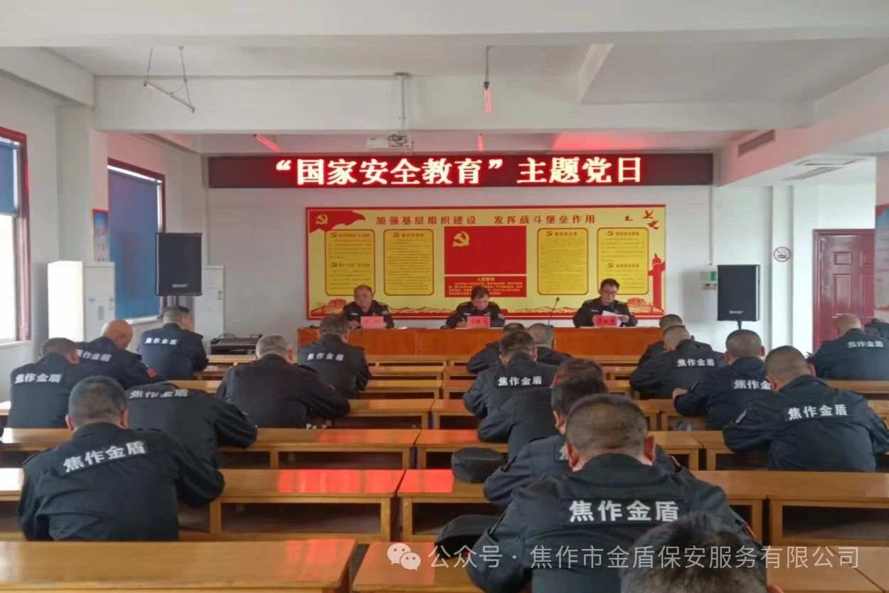 为进一步提升广大党员的国家安全意识,提高维护国家安全的责任感、使命感,积极主动学习国家安全的有关法律、法规,4月17日下午,焦作市金盾保安服务有限公司人防和物业联合党支部组织全体党员、预备党员、入党积