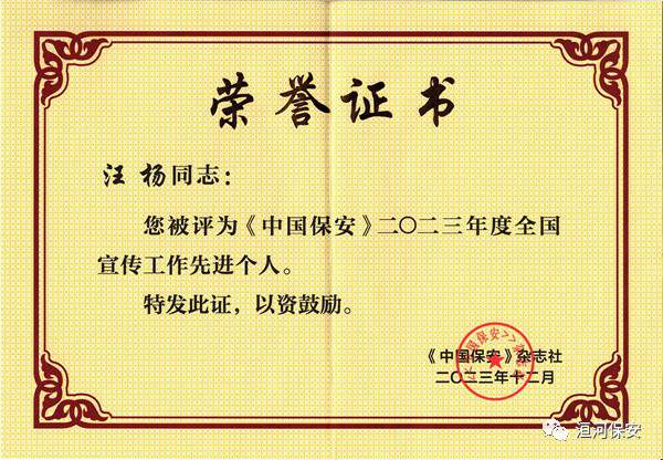 2023年12月,《中国保安》杂志对2023年度全国保安行业宣传工作成绩突出的集体和个人进行了表彰,公司综合办公室汪杨同志荣获“2023年度全国宣传工作先进个人”称号。 《中国保安》杂志是由公安部主管