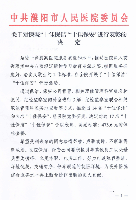 近日,从濮阳市人民医院获悉,该院开展了“十佳保安”评选活动,活动以服务态度好、工作踏实敬业为标准,通过多轮严格筛选,最终评选出优秀人员,其中鹤壁市鹏翔保安服务有限公司派驻该院服务的安志才、孙卫军、栾石