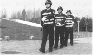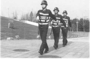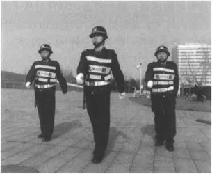 三、三角队形 三角队形,即安全巡逻队形,是指保安员一人在前、两人在后的正三角巡逻队形(见图2-14),或两人在前、一人在后的倒三角队形(见图2-15)以及两侧三角队形三种巡逻队形。 无论哪种三角队形,