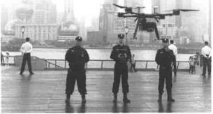 六、机巡 机巡,即遥控无人机巡逻(见图2-5),是利用无线电遥控设备和自备程序控制装置操纵不载人飞行器进行巡逻的一种方式。 保安员通过移动视频终端操作系统连接计算机,整个巡逻区域的立体场景就浮现在眼前
