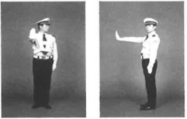 5.右转弯手势—准许车辆右转弯 (1)左臂向前平伸与身体呈90度,掌心向前,手掌与手臂夹角不小于60度,五指并拢,面部及口光同时转向右方45度。 (2)右臂与手掌平直向左前方摆动,手臂与身体呈45度,