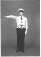 3.左转弯手势——准许车辆左转弯 (1)右臂向前平伸与身体呈90度,掌心向前,手掌与手臂夹角不小于60度,五指并拢,面部及目光同时转向左方45度。 (2)左臂与手掌平直向右前方摆动,手臂与身体呈45度