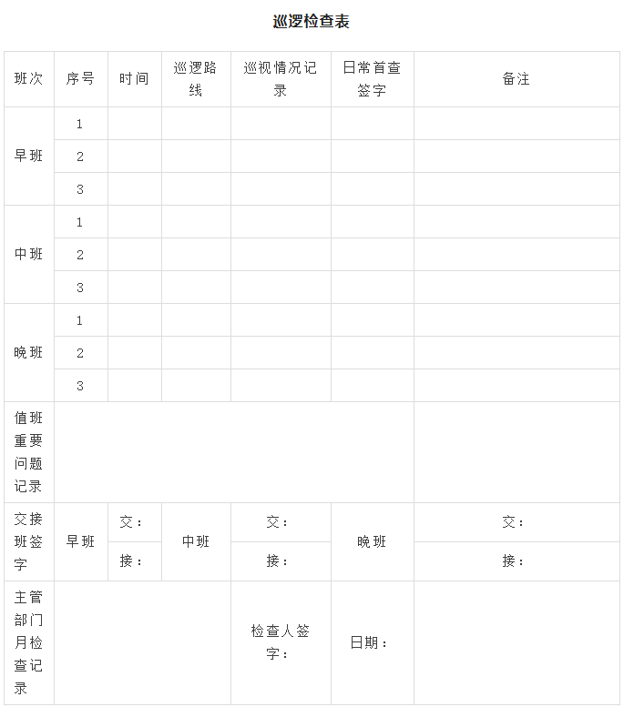 1、小区巡逻,30分钟巡逻打卡一次,不制定固定路线,但不留死角、偏角。大厦巡逻,90分钟巡逻打卡一次,先从天台起,自上而下,从每层楼依次巡逻到地下室,最后到室外。 2、秩序维护员在开展巡逻之前,与上一