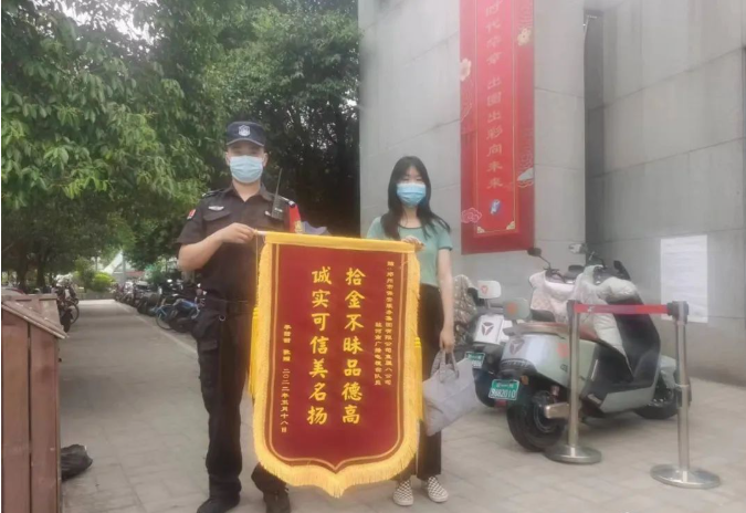 5月18日上午,失主李女士来到郑州保安集团直属八公司驻河南广播电视台保安岗点,将一面绣有“拾金不昧品德高 诚实可信美名扬”锦旗和一封亲自手写的感谢信递到了保安员曹航鸣手中,再次对他拾金不昧的行为表示感