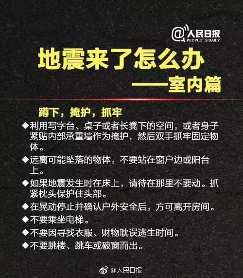 地震自救小常识顺口溜 遇地震,莫惊慌,保镇静,少伤亡。 先颠簸,是近震,只摇晃,震必远。 是远震,不用管,若近震,莫等闲。 住楼房,别慌张,到小间,暂躲藏。 厨与厕,牢又坚,跨度小,较安全。
