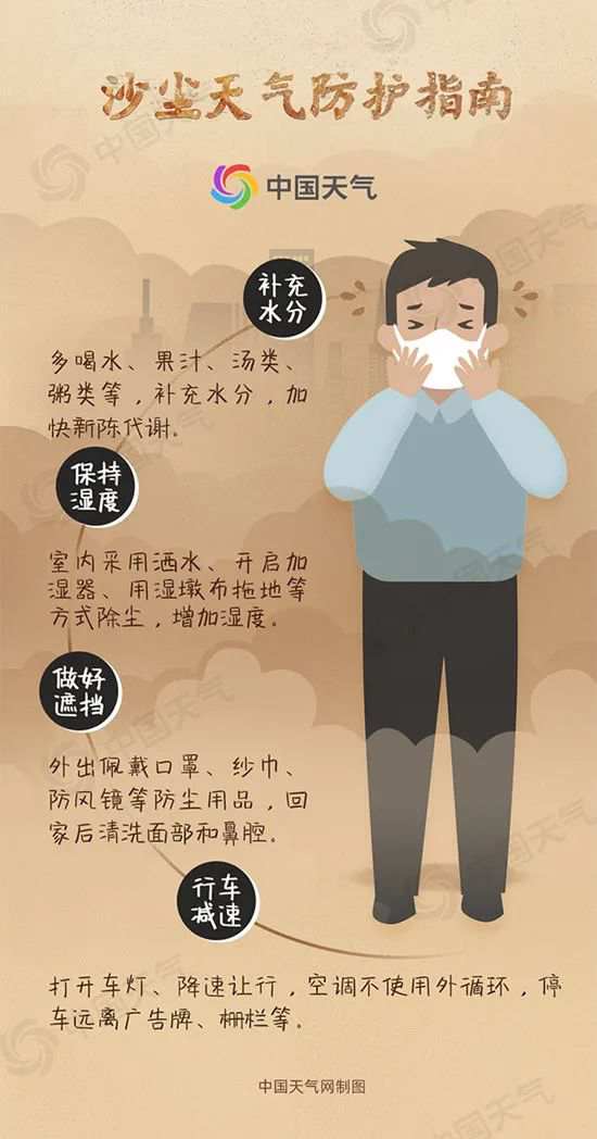 沙尘天气会造成空气质量下降,严重影响人们日常生活,对生态环境、部分设施农业也会造成一定影响。一旦收到气象部门发布的沙尘暴预警,请及时采取防范措施,减少沙尘带来的不利影响。 老年人、儿童、孕妇、患有呼吸
