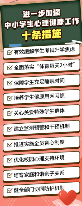 进一步加强中小学生心理健康工作十条措施 为落实健康第一教育理念,进一步提高中小学生心理健康工作水平,针对中小学生心理健康阶段性特点和突出问题,制定以下工作措施。 ■ 有效缓解学生考试升学焦虑 减轻学生