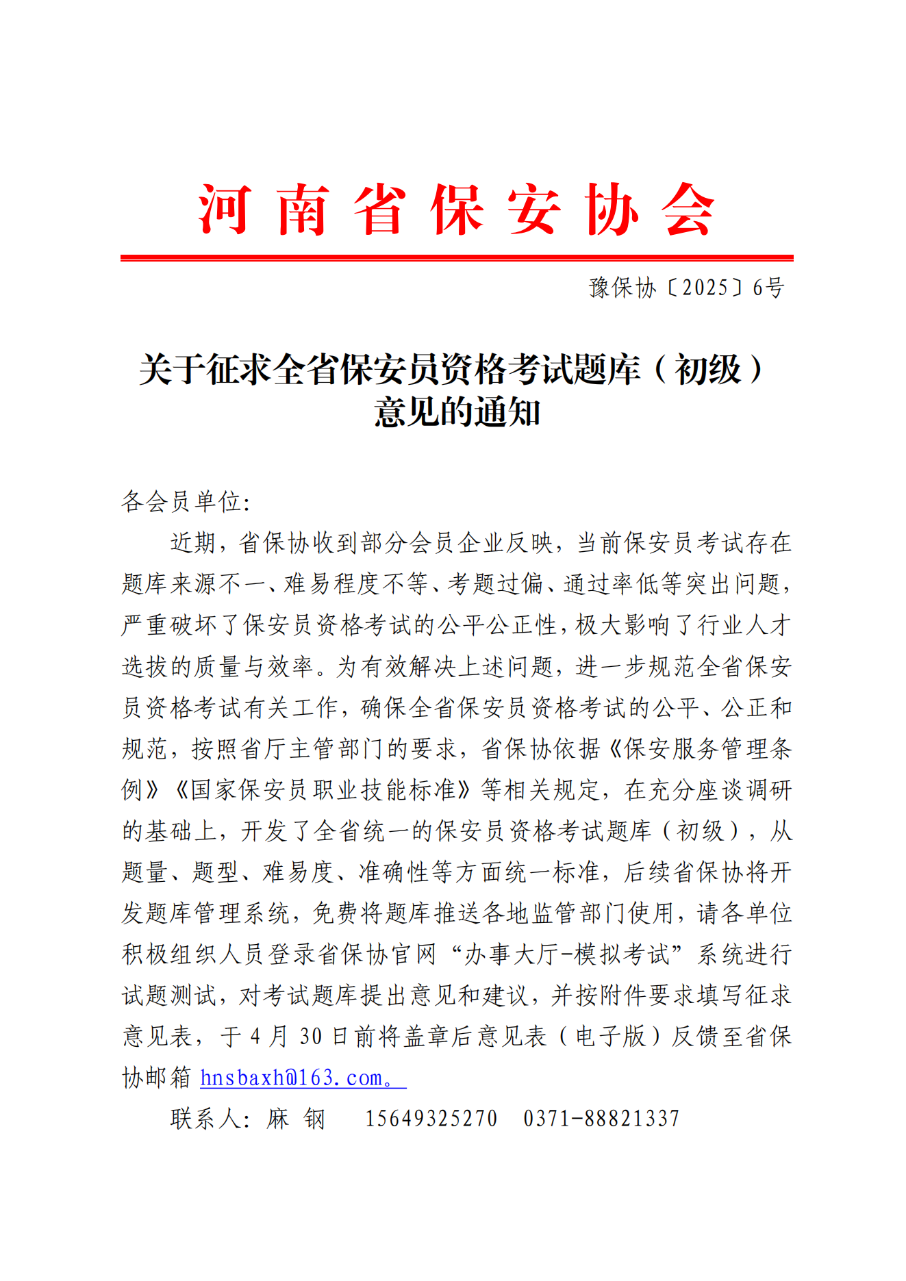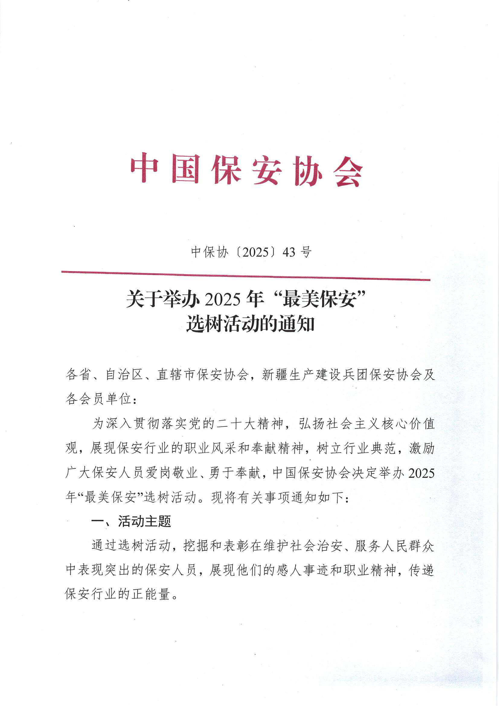 各会员单位: 现将中国保安协会《关于征集2025中国保安高质量发展论坛论文的通知》(中保协〔2025〕60号)转发你们,请认真按照通知要求,积极踊跃投稿,并于6月15日前发送至协会邮箱:hnsbaxh