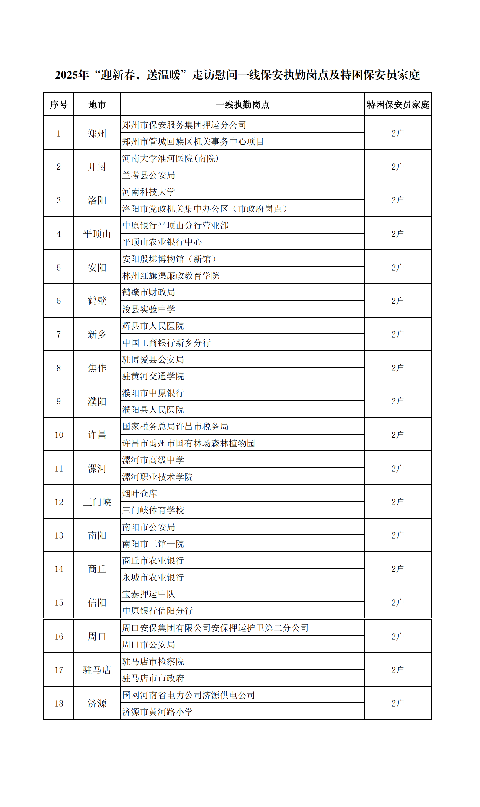 为体现对广大保安从业人员的关心关怀,省保协拟对全省36个一线保安执勤岗点和36户特困保安员家庭进行“迎新春,送温暖”走访慰问,经前期企业排摸、协会初筛、监管部门审核等流程现将具体慰问名单进行公示。 公