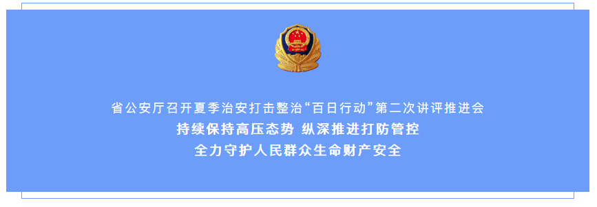 8月29日,省公安厅召开全省公安机关夏季治安打击整治“百日行动”第二次讲评推进会,贯彻落实公安部和省委有关部署,对全省公安机关“百日行动”专项工作进行阶段总结,就持续保持高压态势、纵深推进“百日行动”