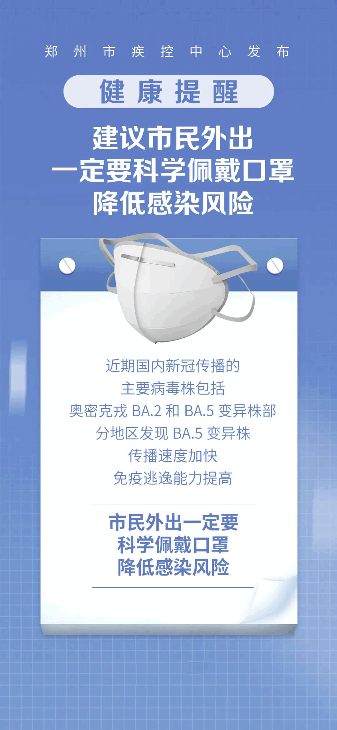7月11日,郑州市疾控中心发布健康提醒:近期国内新冠传播的主要病毒株包括奥密克戎BA.2和BA.5变异株,部分地区发现BA.5变异株传播速度加快,免疫逃逸能力提高,建议市民外出一定要科学佩戴口罩,降低