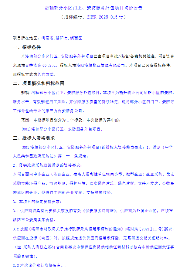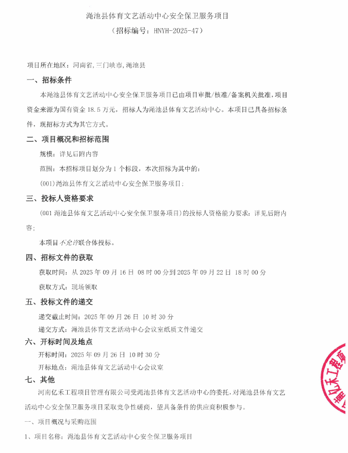 中国邮政储蓄银行股份有限公司信阳市分行2026年度保安服务采购项目 招标公告 项目编号:CG•2025-信阳市分行-综合管理部-005 河南宏业建设管理股份有限公司(以下简称采购代理机构)受中国邮政储