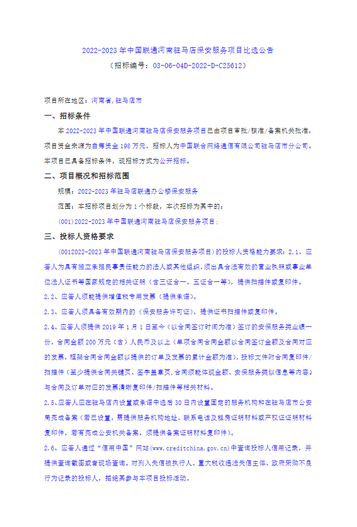 本比选项目为2022-2023年中国联通河南驻马店保安服务项目(采购代理编号:03-06-04D-2022-D-C25612),采购人为中国联合网络通信有限公司驻马店市分公司,采购代理机构为公诚管理咨