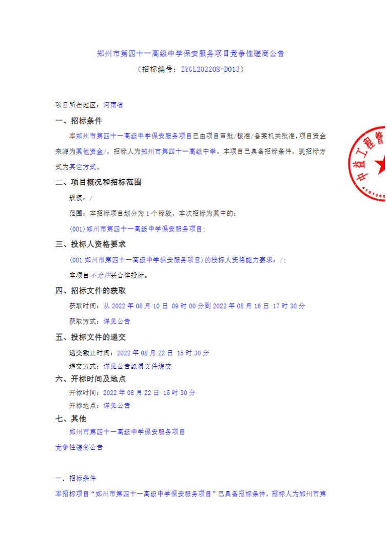 郑州市第六初级中学校园安保服务项目 竞争性磋商公告 项目概况 郑州市第六初级中学校园安保服务项目招标项目的潜在供应商应在中益工程管理有限公司获取磋商文件,并于 2022 年 8月 19日9时30分(北