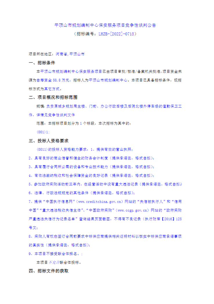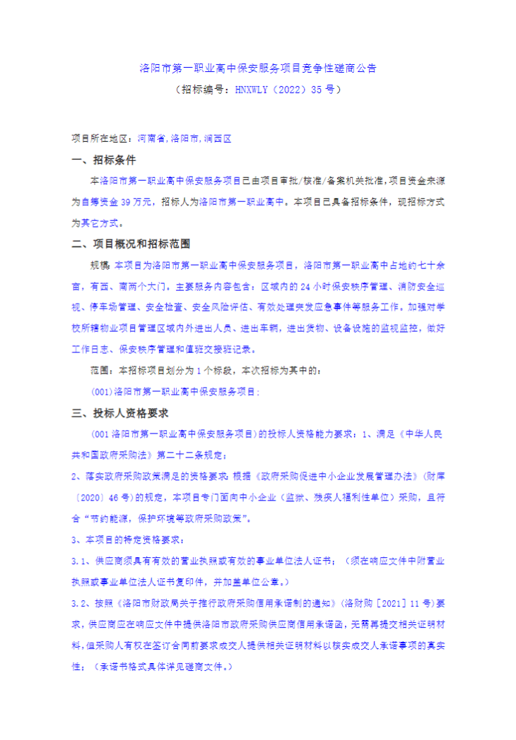 招标编号:HNYZ-2022-41 1.招标条件和方法 1.1采购条件 中国邮政集团有限公司河南省尉氏县分公司保安服务业务外包项目已具备招标条件,经相关部门批准,现对该服务项目实施公开招标活动,公开邀