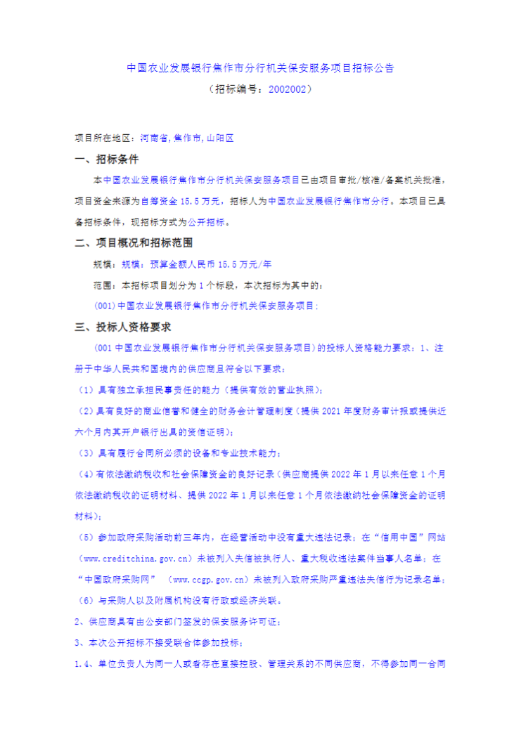 郑州自贸区分行保安服务业务外包集中采购项目招标公告 1、招标条件 本招标项目郑州自贸区分行保安服务业务外包集中采购项目,招标人(项目业主)为 中国农业银行股份有限公司郑州自贸区分行 ,项目已具备招标条