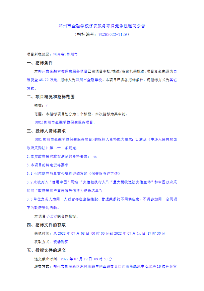 河南省第二实验中学(东校区)保安服务项目竞争性磋商公告 项目概况 河南省第二实验中学(东校区)保安服务项目的潜在供应商应在中泰工程管理有限公司(郑州市高新区中原广告产业园4号楼16层246)获取采购文