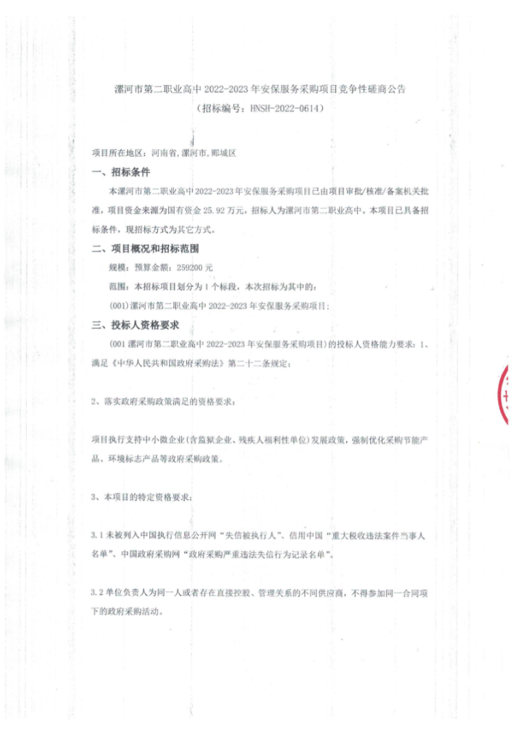 河南英典工程管理有限公司受河南水利与环境职业学院委托,就河南水利与环境职业学院花园路校区及信阳校区安保服务项目进行竞争性磋商采购,诚邀符合条件的潜在供应商参加磋商。 一、项目名称:河南水利与环境职业学